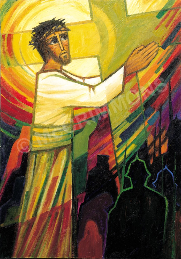The image of the risen Lord in station 16 shatters the overwhelming feeling of darkness and impending doom with its vivacious display of colour, sympathetic with the immense joy of the resurrection. Christ is risen!